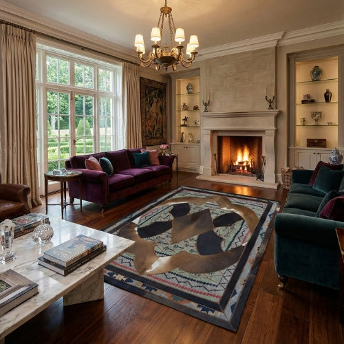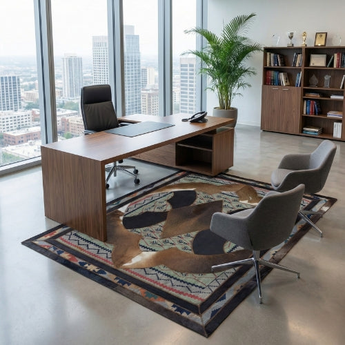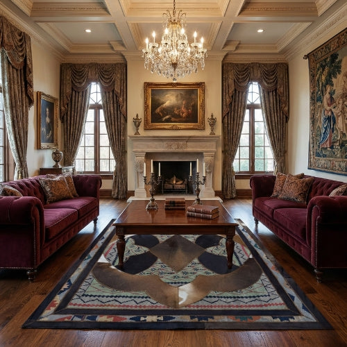 In this Durable and strikingly unique floor rugs, the pieces of cowhide and kilim are patched together and it is covered with lining that sewed behind it. All of the working process is done by human resources by hand. The products designs are innovation and each carpet is unique in terms of colors and size because the kilims colors and design, and cowhide color are different.