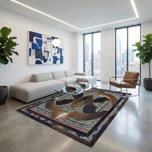 Uncover a touch of sophistication and contemporary style with our Modern Luxury Area Rug, expertly handmade, combining cowhide and Kilim craftsmanship. The rug features a vibrant, multicoloured patchwork design, bringing a unique and eclectic essence to any room. Measuring 140*180 cm, it's a versatile size that's perfect for a variety of spaces, from living rooms to bedrooms. Carefully constructed with a knife-edged finish and a thickness of 0.7 cm, this area rug is both durable and low-maintenance. Its quality materials and production technique ensure a luxurious feel underfoot, while its rectangular shape regional design offer a timeless appeal that complements modern and traditional décor alike.